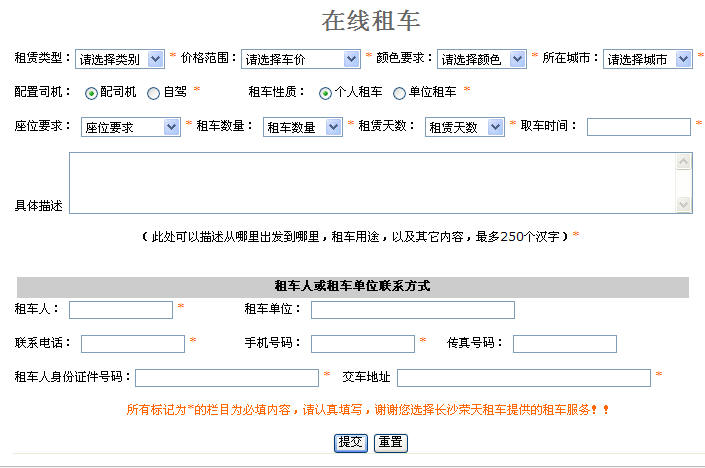 3、選擇或認(rèn)真填寫帶"*"的欄目,尤其是租車人或租車單位的詳細(xì)信息。認(rèn)真填寫上述必填信息將有助于我們及時(shí)和您取得聯(lián)系。